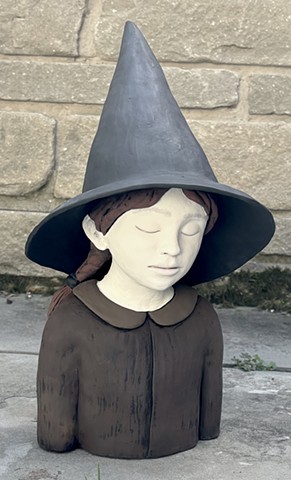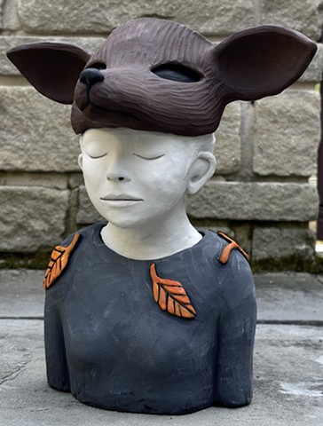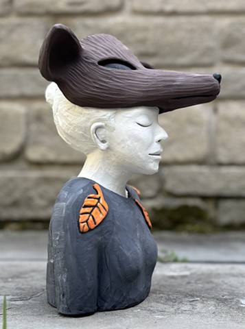Rabbit Girl with Wolf Visor. Painted ceramic , (18” height).